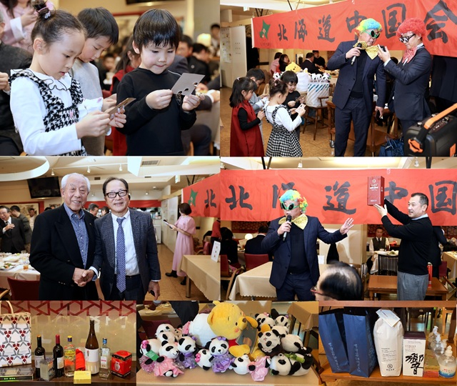 这次恳亲忘年会,北海道中国会和北海道中国工商会为所有参会者准备了礼品。宾果抽奖大会开始,副会长兼组织委员长于德志社长和留学生支援委员长韩德善先生化妆登场主持抽奖。晚会主持介绍完这次礼品赞助团体和个人后,韩德善先生就开始宣布中奖号码。随着中奖号码的增加,宾果听牌者也逐渐增加。最早的宾果一等奖由会员笹村一先生获得,在众多的礼品中,他选择了5公斤大米。日本的大米疯涨背景下,这一不起眼的礼品被选为一等奖也是当今日本的生活风景的一大特色。二等奖由家属会员郭凤英获得,她在开始时,就看到有一瓶她喜欢喝的MTJ观光株式会社加藤哲社长赞助的【响】威士忌,希望今天能够抽奖获得。结果心想事成,她如愿的抽到了二等奖,获得了【响】威士忌。三等奖获得者是今天的晚会主持胡尔西丹社长,她选了高桥健康研究所曾祥顺社长提供的24K黄金美容棒。这次联合恳亲忘年会,邀请了会员的家属,特别有14位的孩子们的参加,增加了忘年会的热闹气氛。筹备委员会也听取副会长胡尔西丹社长的建议,为孩子们准备了专用奖品【熊猫玩偶】,没想到【熊猫玩偶】也深受大人的欢迎。每次宾果中奖,都迎来欢声和掌声,获奖摄影也成为愉快的留念。最后每一位都取得了自己喜欢的礼品,满载而归。