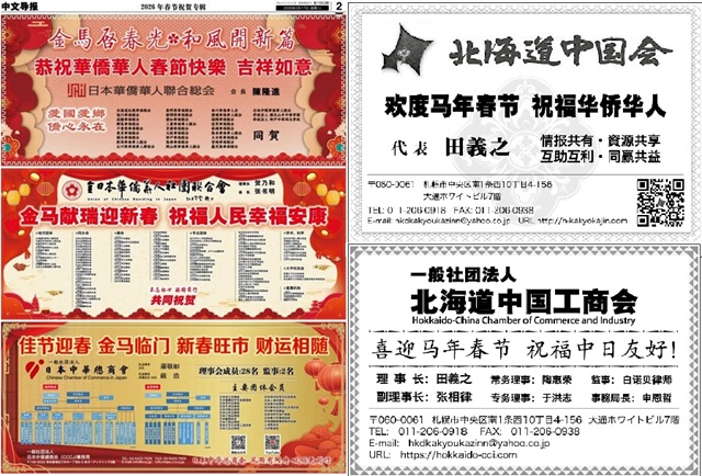 编者按:2026丙午马年春节来临,《中文导报》推出“迎春贺禧”大型祝贺专辑,向广大旅日华侨华人致以春节问候和美好祝福。感谢侨团侨社、中日企业、华侨华人等参与春节祝贺,感谢每一位在奋进路上披星戴月、沐雨栉风的旅日同胞和朋友们的支持和关怀。