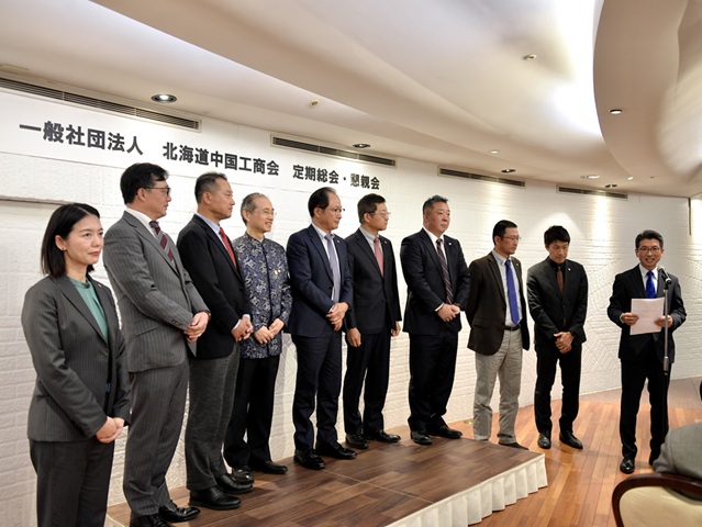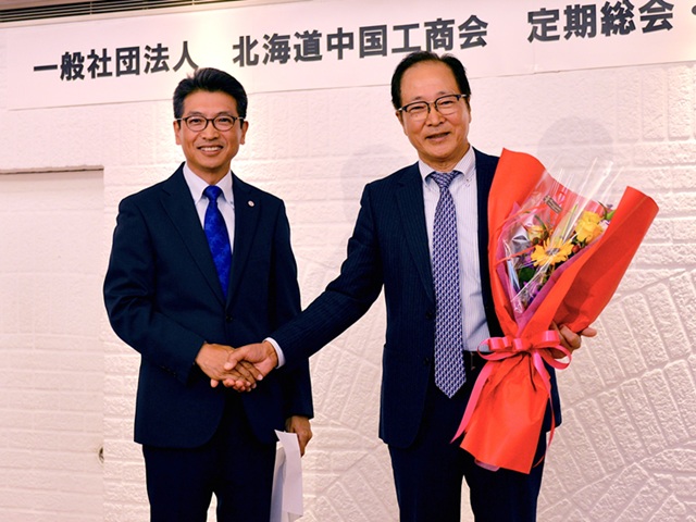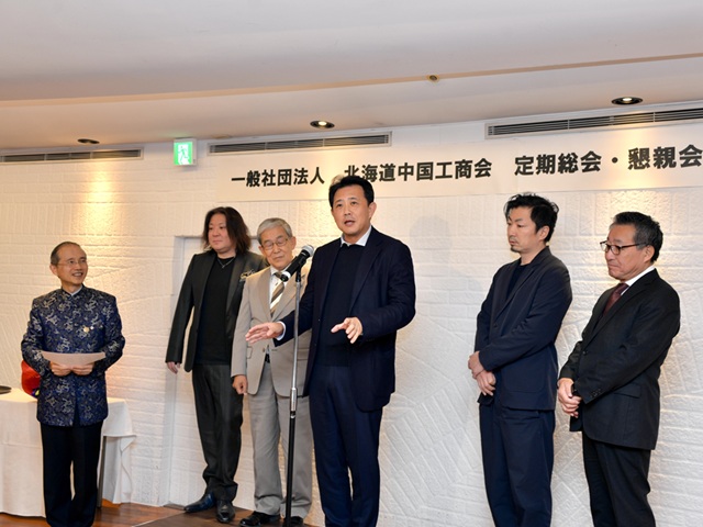 続いて、新理事長の張相律氏が登壇し、田会長への感謝とともに抱負を述べました。「今、世界情勢や経済環境は大きな転換期を迎えております。こうした中で、我々は、急速に国力を増している中国の天の時と、日本の宝の島の北海道という地の利と、北海道中国工商会の人の和を活かして、北海道と中国の経済の架け橋として新たな価値を創出してまいりたいと思っています。」と力強く語りました。